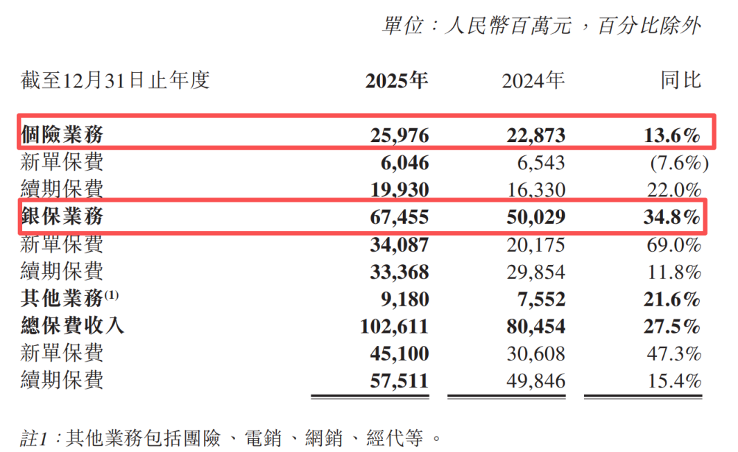 个险渠道仍在转型中。2025年,个险实现总保费收入259.8亿元,同比增长13.6%;个险新业务价值实现18.5%的正增长。