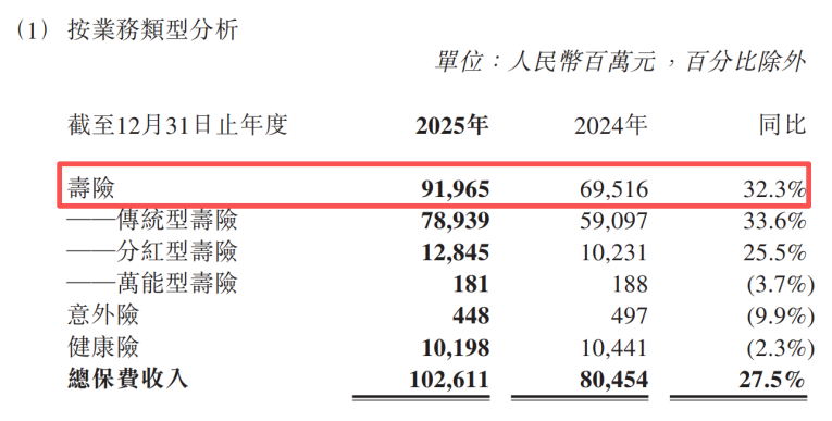 2025年,寿险业务实现保费收入919.65亿元,同比增长32.3%,其中传统型寿险实现保费收入789.39亿元,同比增长33.6%,分红型寿险实现保费收入128.45亿元,同比增长25.5%。