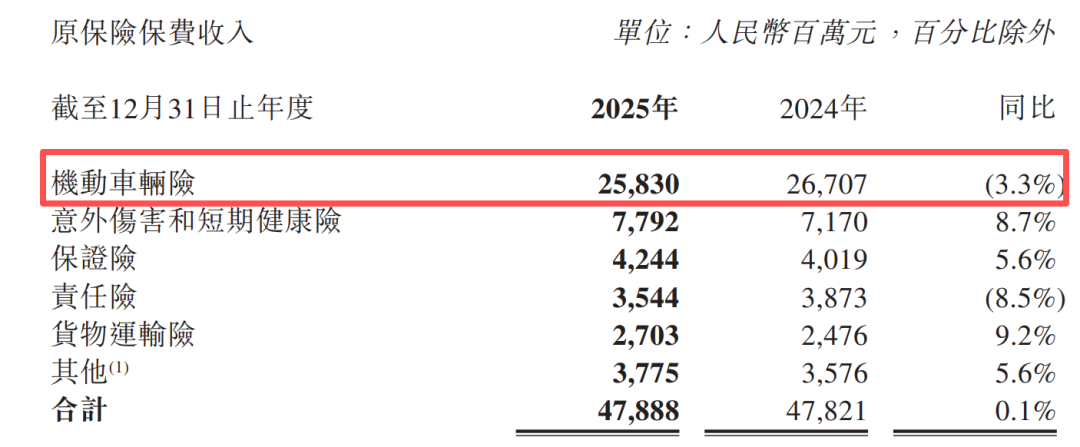 分险种来看,占据阳光财险保费业务53.9%的车险业务,在2025年实现保费收入258.3亿元,较去年同比减少3.3%。
