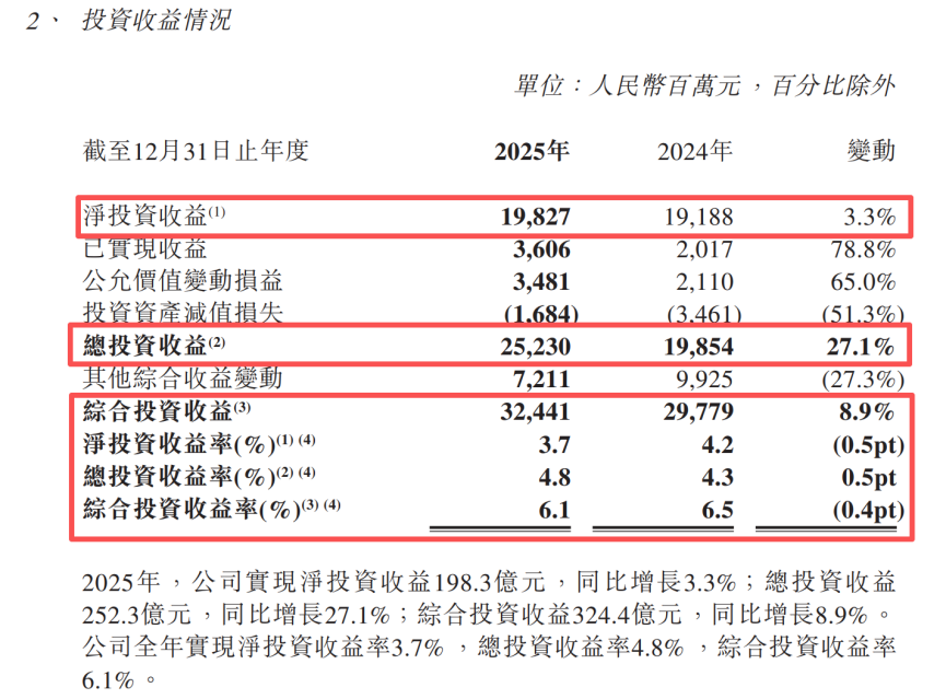 年报显示,阳光保险总投资资产规模为6402.0亿元,较上年末增长16.7%。实现总投资收益252.3亿元,同比增长27.1%;综合投资收益324.4亿元,同比增长8.9%;净投资收益实现198.3亿元,同比增长3.3%。