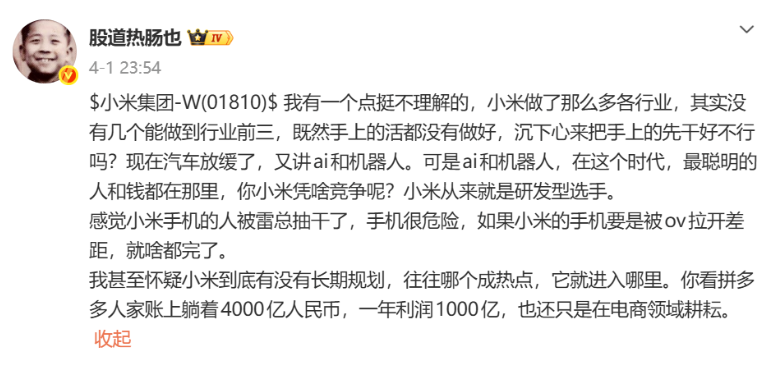 4月2日,小米集团-W(01810.HK)股价跌至2025年以来最低,不足31港元,较2025年年中高点已腰斩。知名私募日斗投资董事长王文发文质疑称,小米涉足多行业却鲜有进入前三,未聚焦核心优势,仅追随热点,缺乏长期战略,企业需如自然进化般打造“杀手锏”方可长远发展。