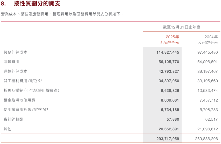 财报中显示,相比于2020年547.45亿元的人力外包成本,2025年的人力外包成本已经增至1148.27亿元。外包,已不再是边缘性的补充,而是顺丰运营体系中举足轻重的一部分。