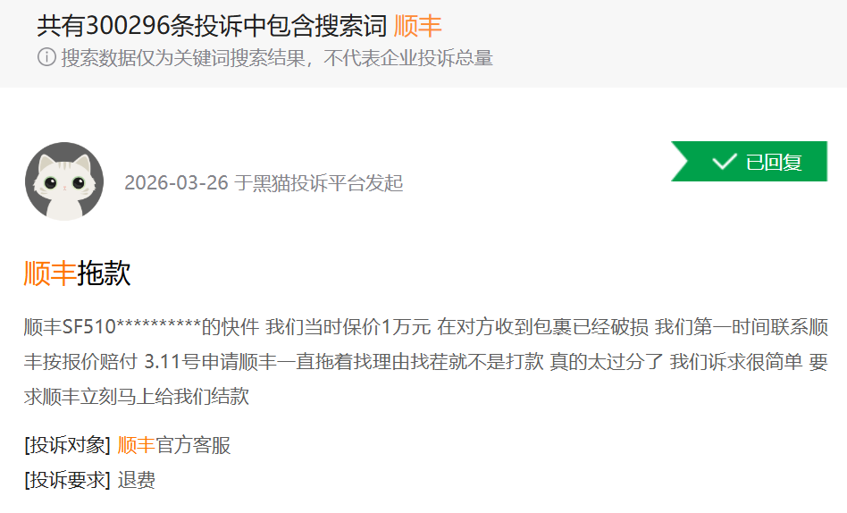 打开黑猫投诉平台,与“顺丰”相关投诉累计已超过30万条,进一步印证了顺丰在服务波动与体验上的落差。