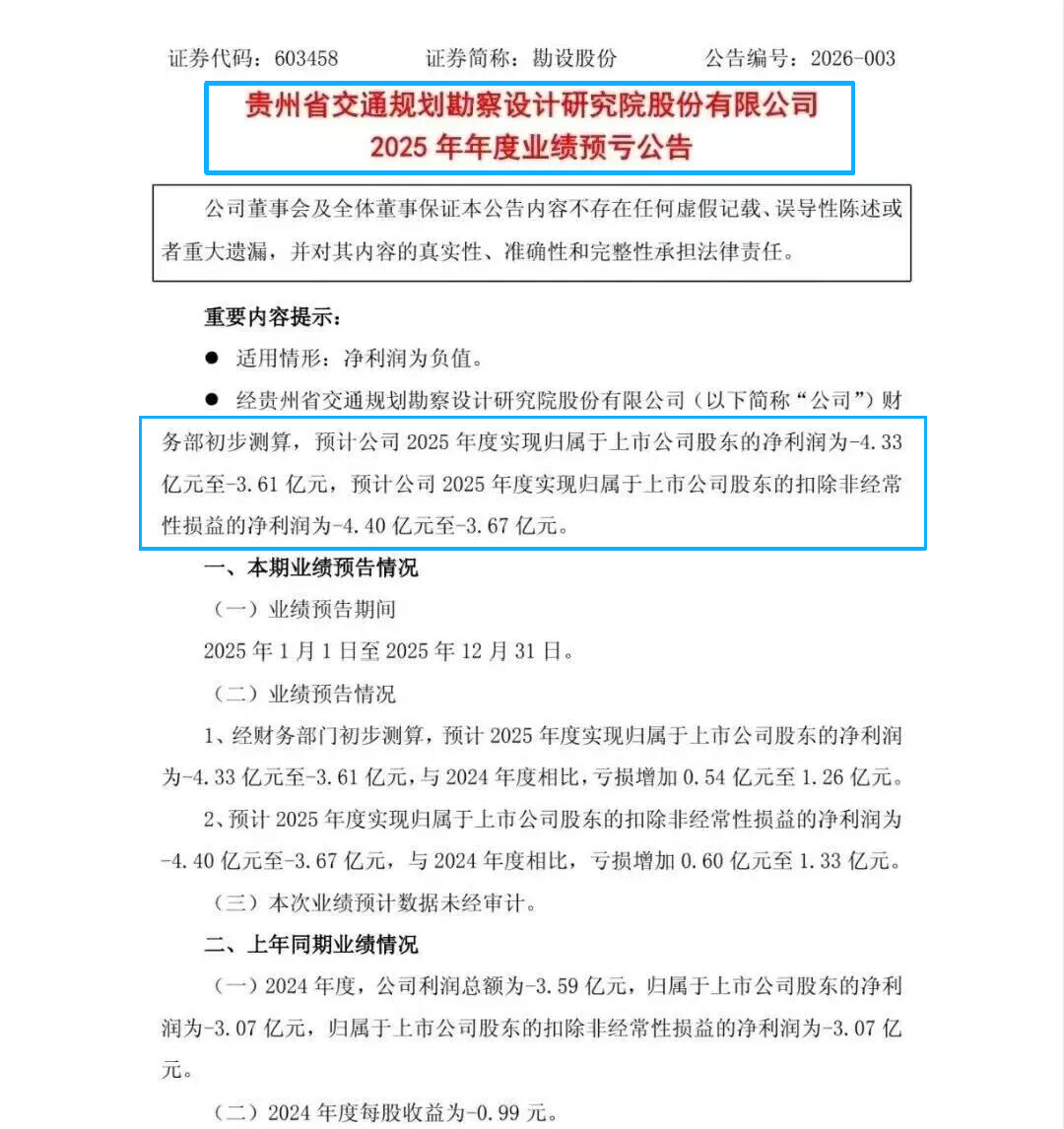 当然,上市设计院也是类似的情况,以贵州省交通规划勘察设计院为例,其2025年归母净利润预计是亏损三四个亿,扣非净利润数据差不多;
