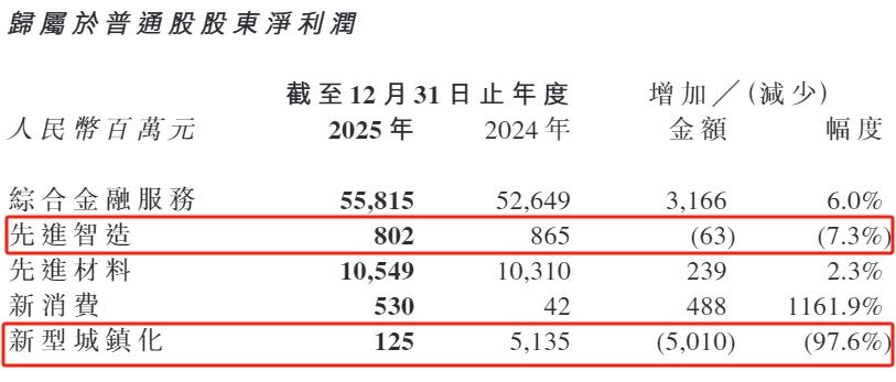 具体到各业务板块,年报显示2025年综合金融、先进材料、新消费三大板块归母净利润实现正增长。先进智造、新型城镇化利润下滑。特别是新型城镇化板块,其包括了房地产等相关业务,2024-2025年归母净利润从51.35亿元暴跌为1.25亿元,跌幅接近98%。