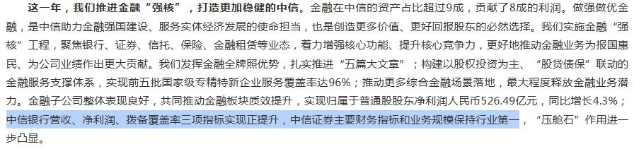 中信股份对中信证券的表述也出现微妙变化。奚国华《2024年致股东的信》对中信证券的描述是“中信证券主要财务指标和业务规模保持行业第一”;奚国华《2025年致股东的信》中,中信证券的表述变为“中信证券归母净利润创历史新高...资产突破2万亿元”,不再强调主要财务指标、规模行业第一的地位。