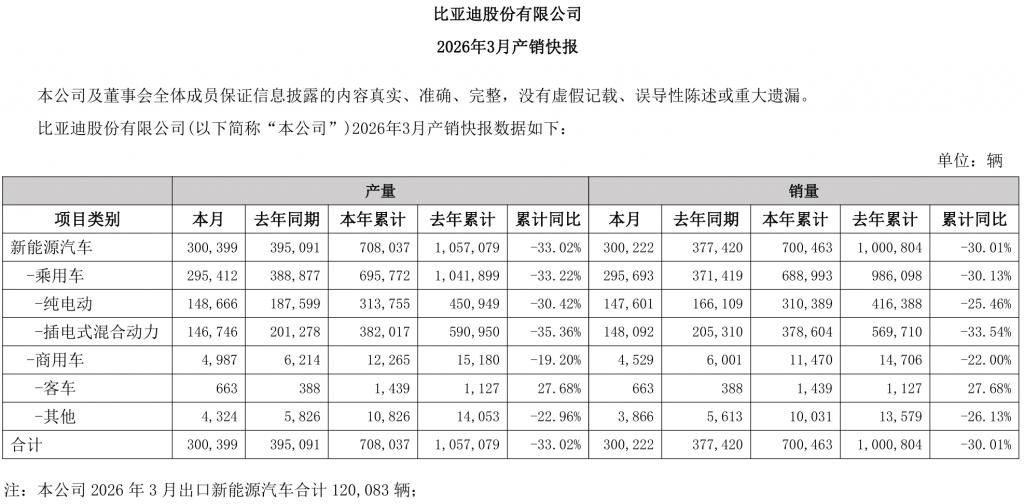 4 月 1 日,比亚迪汽车对外公布 2026 年 3 月以及 2026 年一季度销量情况。数据显示,3 月比亚迪汽车销量为 300222 辆,同比下滑 20.45%,其中比亚迪乘用车销量为 295693 辆,纯电动车销量为 147601 辆,插电式混合动力销量为 148092 辆;出口新能源汽车销量为 120083 辆。
