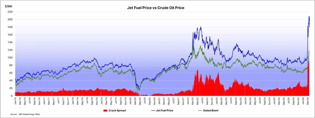 伊朗危机打破了这种关联。自 2026 年 2 月底以来,原油价格已上涨约三分之一,而航空燃油价格则上涨了两倍多。