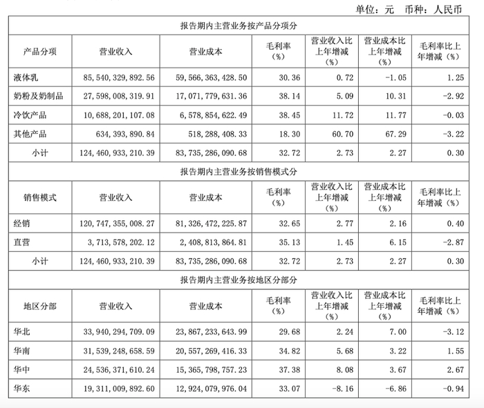 液态奶方面,高端品类金典有机纯牛奶系列产品零售额较上年保持双位数增长;金典鲜牛奶系列产品零售额较上年实现了54.6%。受此影响,液体乳业务毛利率同比增长1.25%至30.36%。