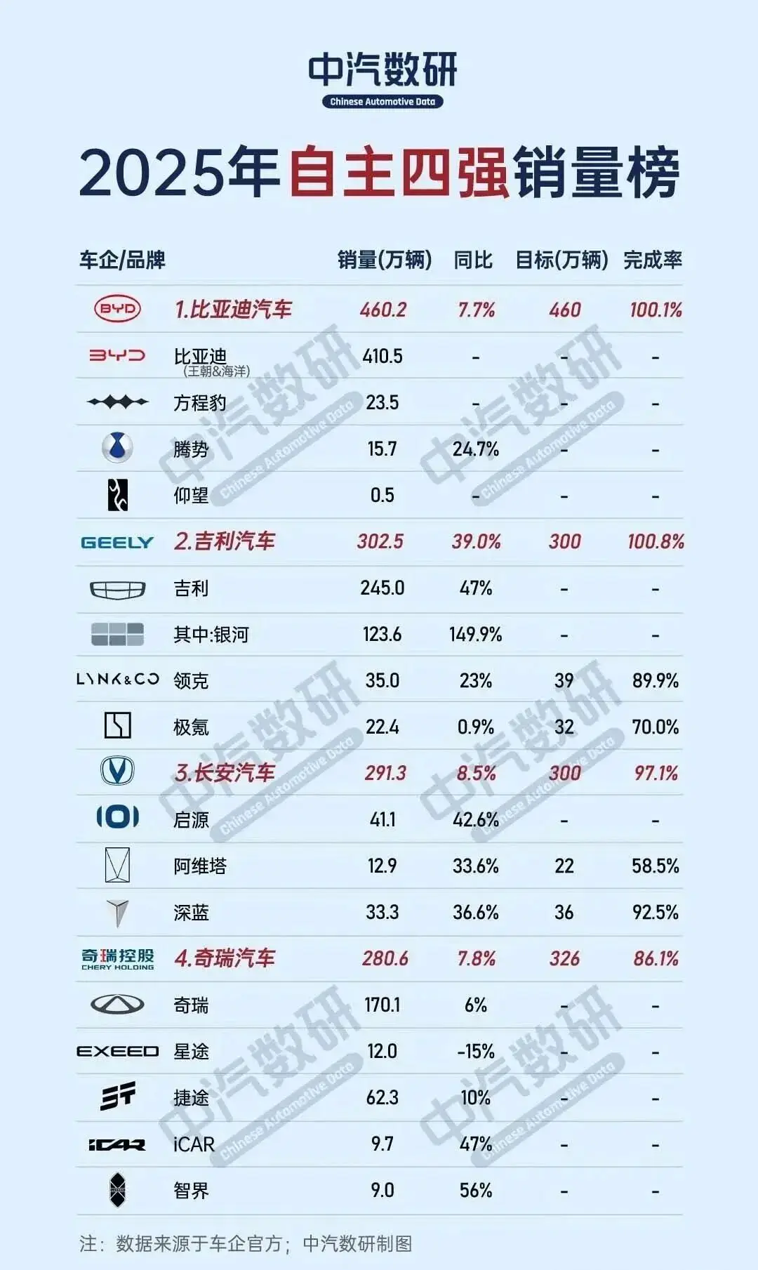 比亚迪、吉利、奇瑞和长安是国内自主四强车企,2025年总销量约1335万辆,几乎占据了中国车市半壁江山。