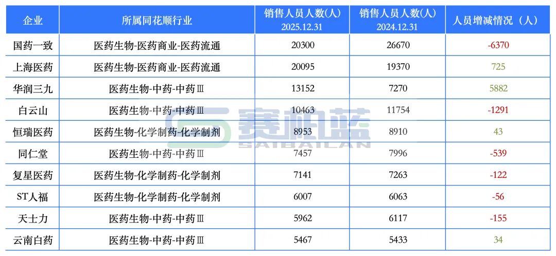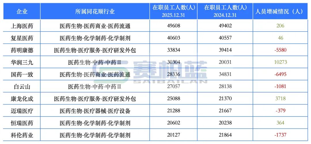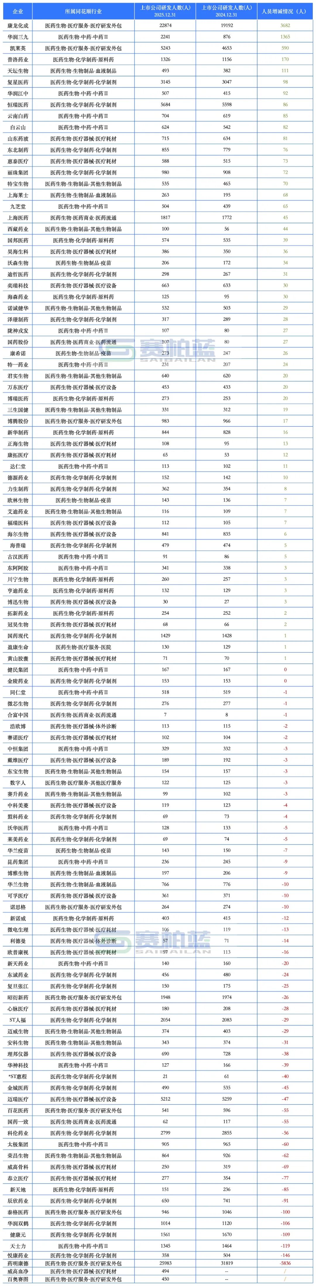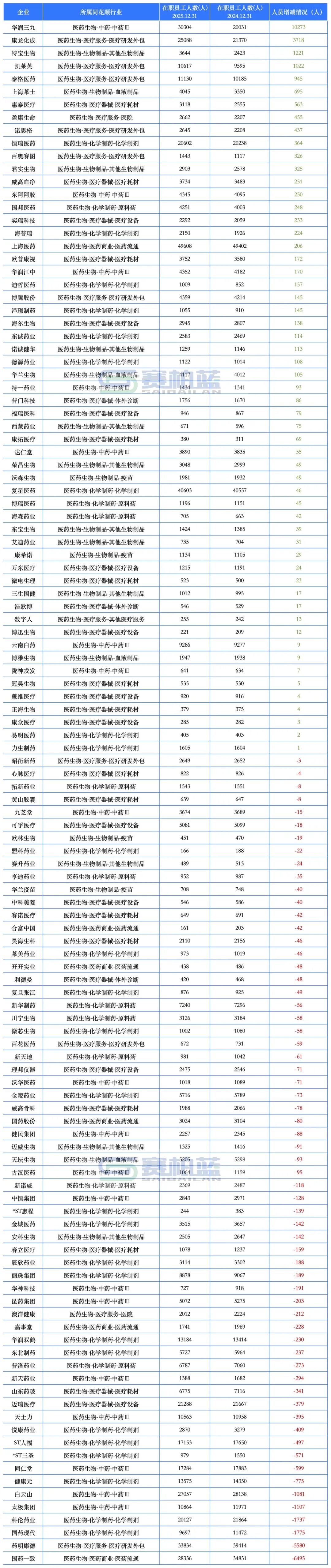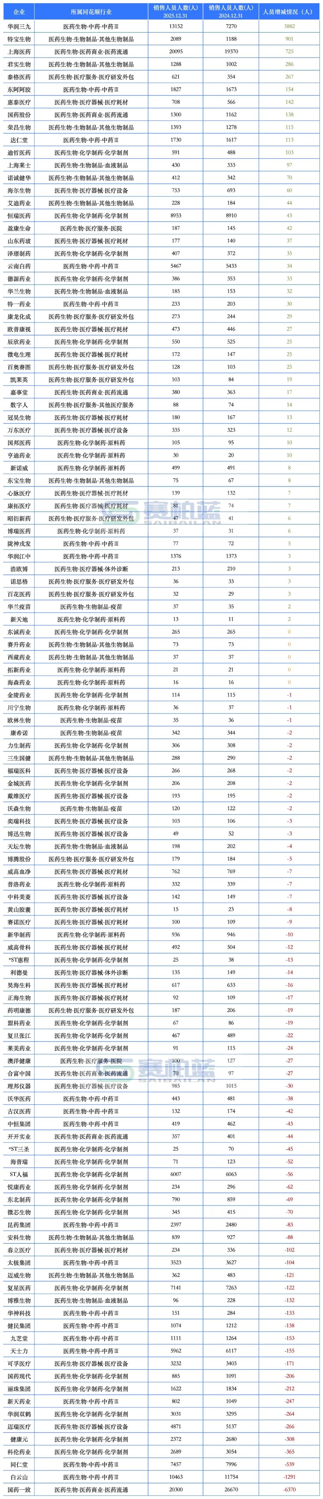 医药企业2025年年报披露,人员结构出现了怎样的变化?赛柏蓝下面从在职员工、销售人员及研发人员数量变化三个维度进行分析(总表见文末)。