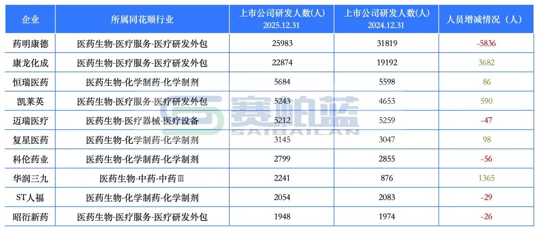 华润三九主要因2025年合并天士力后导致人员数量增加,其他多为医疗研发外包企业。