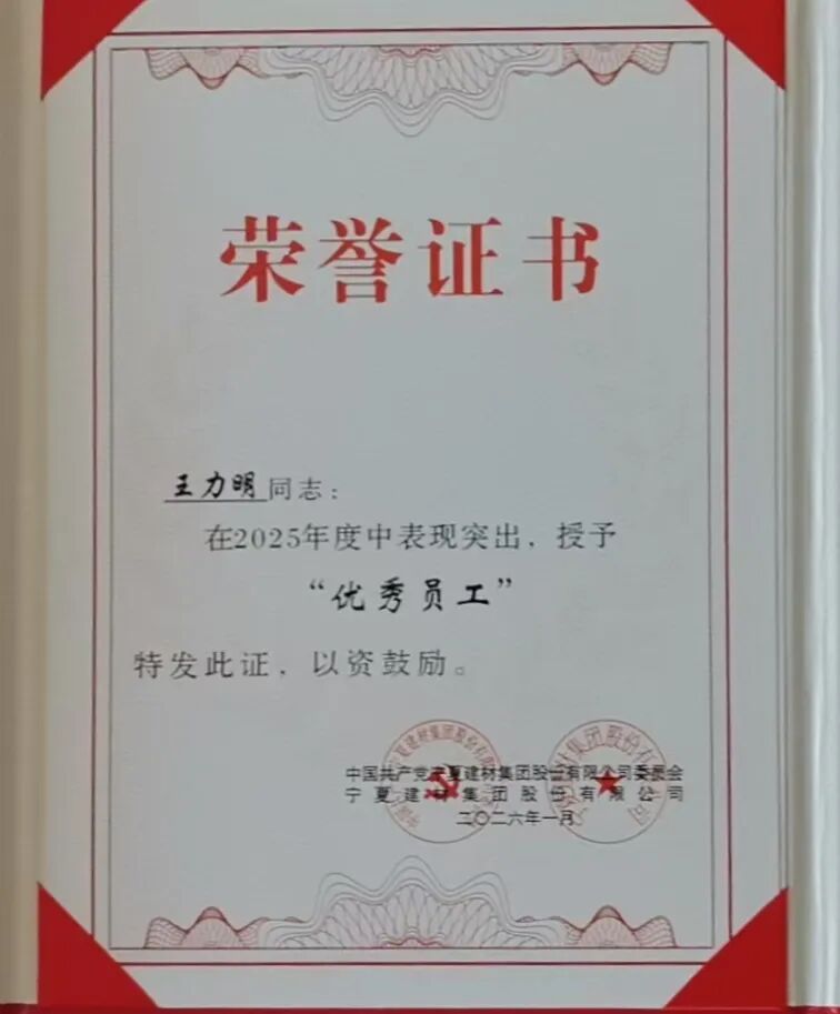 宁夏赛马兰山分厂电气工程师王力明,自入职至今已有34年,是一位“名副其实”的老建材人。他有着多年的电气职业生涯,从一名普通的电工成长为公司的技术骨干,攻克了一道道电气技术难题,有力保证了公司的安全生产,被宁夏建材授予2025年度优秀员工荣誉称号。