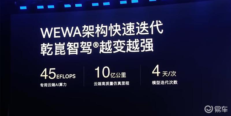 智能驾驶方面,宝骏华境S搭载的华为乾崑智驾ADS Pro,其采用的是和高阶版同源的WEWA架构,云端+车端双重加持。算力上,云端AI算力达45 EFLOPS;数据上,借助World Engine世界引擎,高质量训练里程突破10亿公里;算法上,模型迭代每4天一次。