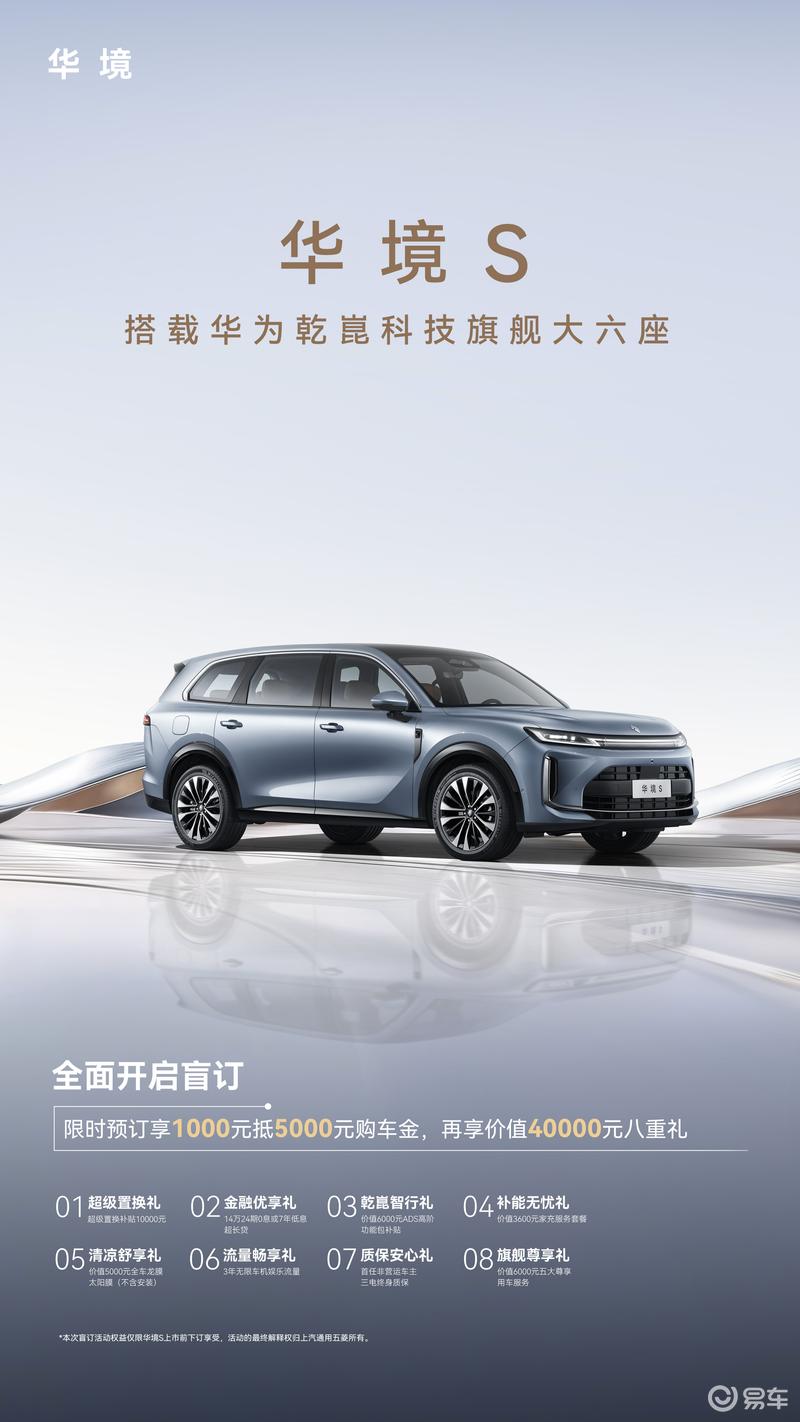 易车讯今日,在华境S领航科技品鉴会上,华境S正式开启盲订,限时预订享1000元抵5000元膨胀金。还可享受价值40000元的八重礼。新车定位为科技旗舰大六座,全系标配华为鸿蒙座舱、智驾ADS 4以及乾崑车云HUAWEI IVCS。