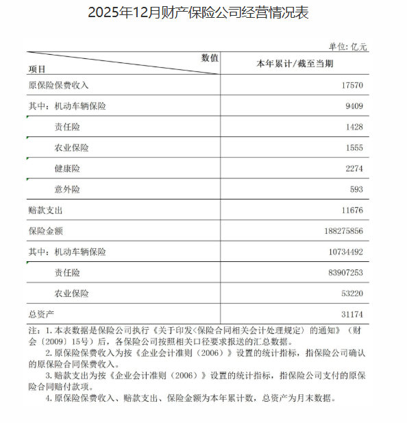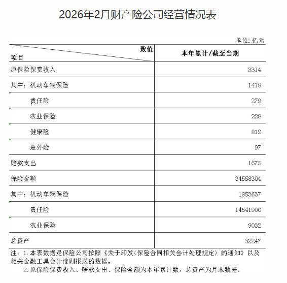 3月27日,国家金融监督管理总局公布数据称,截至2026年2月末,财产险公司实现原保险保费收入3314亿元,同比增长3.5%。其中,1月保费2108亿元,同比增长5.8%;2月保费1205亿元,同比下降0.3%,呈现前高后低态势。