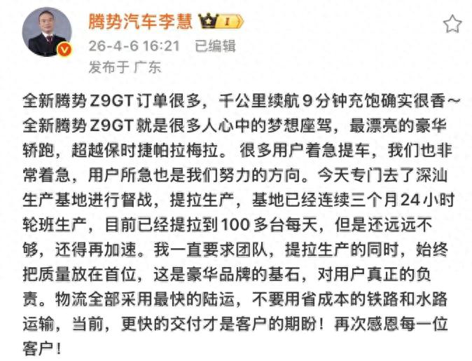 据报道,腾势Z9GT订单火爆导致交付延迟,深汕基地24小时生产,日产能提至100台仍不足;3月订单预计4月交付,部分车型需4-6周。