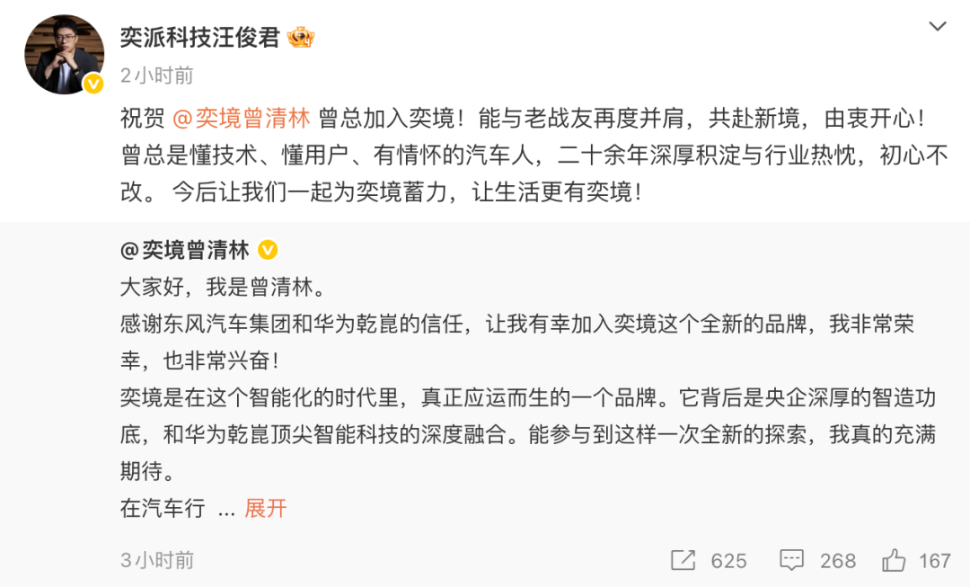 4月7日,奕境汽车正式公布核心管理层任命:汪俊君出任董事长,全方位负责东风汽车集团与华为乾崑深度融合与产品落地;曾清林出任CEO,全面主持品牌各项工作;