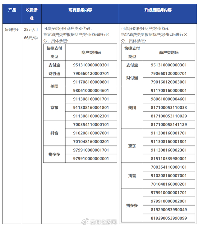 从公告表格看,支付宝对应商户类别码维持不变,抖音对应商户类别码也没有变化。此次扩容主要落在另外四个渠道。财付通新增1个商户类别码,美团新增3个,京东新增1个,拼多多新增2个。也就是说,6月1日以后,订购“超6积分”的持卡人,在这些平台上的部分快捷支付交易,进入多倍积分范围的可能性会比此前更大。