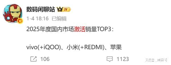博主“数码闲聊站”透露,2025 年国内激活销量中,vivo(含 iQOO)、小米(含 REDMI)和Apple全年都突破了4000 万台,稳居前三。