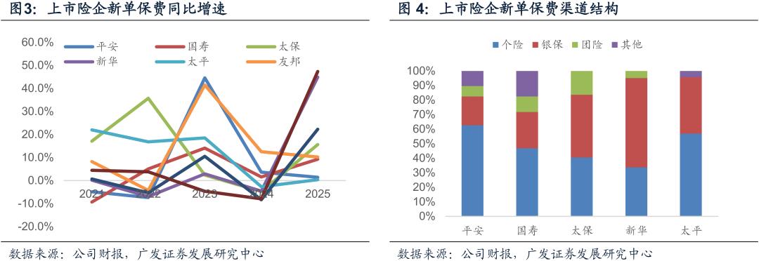 2025年上市险企的新单保费增速分别为:阳光(47.3%)>新华(44.9%)>人保寿(22.3%)>人保健康(16.5%)>太保(+15.7%)>友邦(+10.2%)>国寿(9.3%)>平安(1.5%)>太平(0.4%),主要受益银保渠道高增长,而增速表现分化主因其差异化的产品投放策略以及渠道结构差异所影响。
