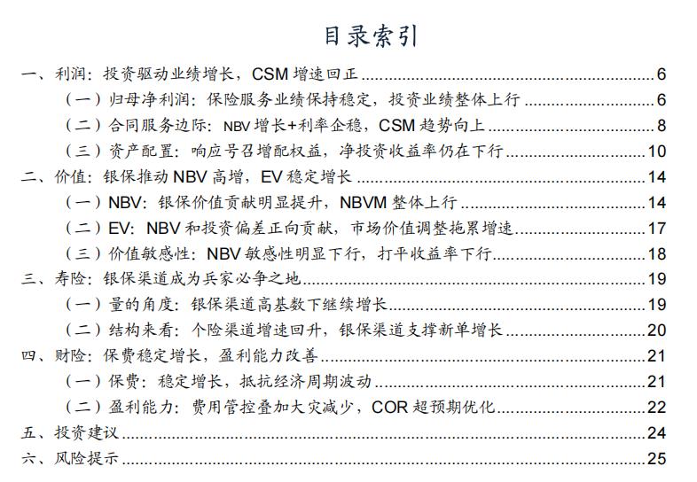 新华保险归母净利润同比增长38.3%,在24年增长201.1%的背景下仍在高速增长,受益于公司率先同业增配权益资产,且权益资产中计入FVTPL的比例更高,推动投资收益率在FVTPL债券类资产公允价值下降的背景下仍同比0.8pct至6.6%,是上市险企中最高的总投资收益率水平,投资服务业绩同比+27.6%。保险服务业绩同比+14.2%,受益于近年来NBV的高速增长,CSM稳定摊销。