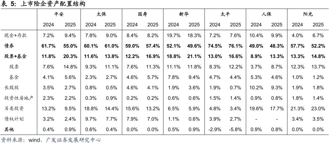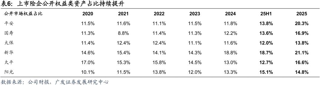 监管持续号召长期资金入市,叠加长端利率低位徘徊,增加权益资产有增厚整体投资收益率水平,上市保险公司在下半年集中提升公开市场权益占比。2025年“股票+基金”占比依次为新华(21.1%)>平安(20.3%)>国寿(16.9%)>太平(16.6%)>阳光(14.8%)>太保(13.8%),同比变动+2.3pct、+8.6pct、+4.7pct、+3.6pct、+1.6pct、+2.2pct,整体都呈现出上行的趋势,一方面受益于权益配置比例的提升,另外受益于市场上行带来的净值增加。且我们对比25年中的比例看,保险公司增加权益配置比例也主要集中于下半年。