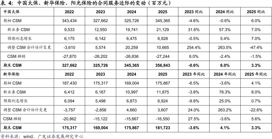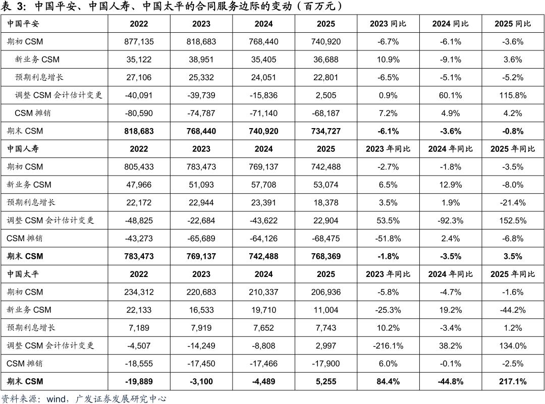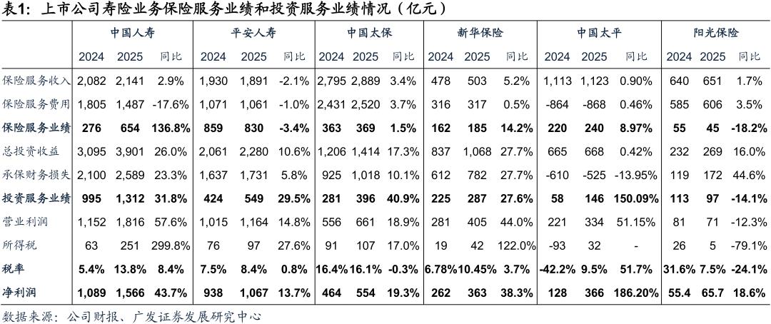 2025年上市险企归母净利润同比增速依次为太平(220.9%)>国寿(44.1%)>新华(38.3%)>财险(25.5%)>太保(19%)>阳光(15.7%)>人保(8.8%)>平安(6.5%),在2024年较高的基数下仍实现了明显增长,主要受益于投资服务业绩的增长,部分公司税率的变化也是利润增长的主要原因。一是2025年沪深300指数上涨17.7%,较2024年的,高于上年同期的14.7%,但全年10年期国债收益率上升17.2个BP,而上年同期下降幅度高达88个BP,因此FVTPL债券类资产的公允价值预计为负,虽然保险公司受益于利率上行,但确实因为新准则的原因,导致短期的财务呈现和长期的经营规律有一定的背离;二是保险服务业绩整体小幅增长,受益于近年来新业务价值的稳步增长,叠加利率趋势企稳,因此CSM增速整体回正,摊销的持续稳定推动保险服务业绩的小幅增长。(如无特殊说明,本报告所有数据均来源于公司财报和wind)。