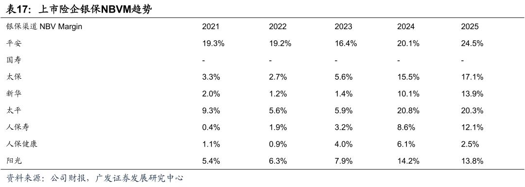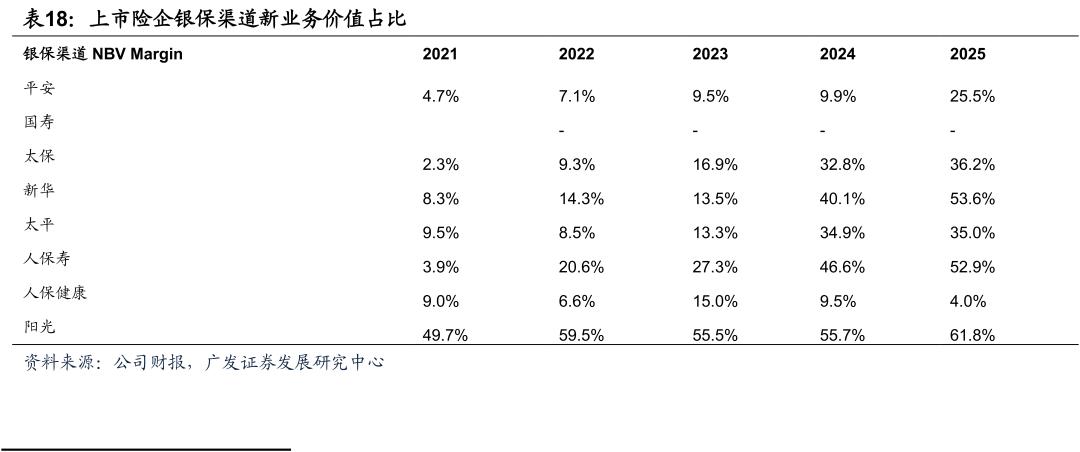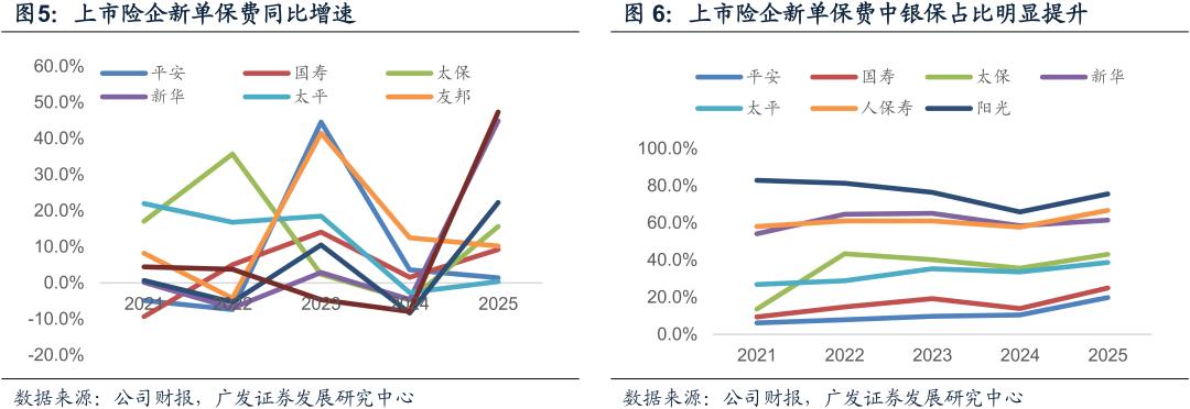 从渠道结构看,监管连续在2023年和2024年下调预定利率情况下,部分保险配置需求提前集中释放,叠加2025年以来监管引导以及行业主动推进分红险产品转型,个险渠道新单需求有所承压。而银保渠道受益于2023年报行合一政策以及银行网点合作从“1+3”扩大至“1+N”,行业竞争模式从过往以渠道佣金为主向以产品、服务、品牌为主的方向转变,行业竞争格局优化有利于头部险企展业,由此驱动2025年银保渠道在低基数下实现新单高增长,银保渠道占新单的比重分别为阳光(75.6%)>人保寿(66.8%)>新华(61.5%)>太保(43.1%)>太平安(38.7%)>国寿(25%)>平安(19.8%)。