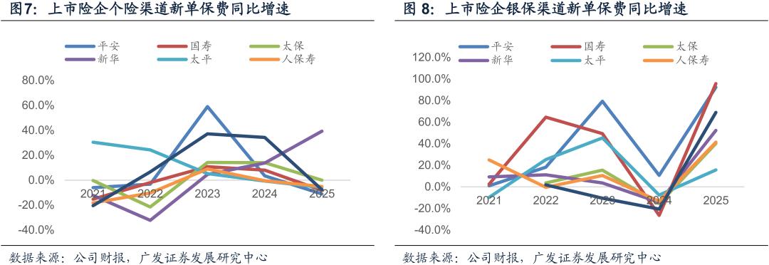 25年上市险企个险渠道增速回暖,而银保渠道有力支撑新单增长。个险渠道方面,受客户需求提前释放以及分红险转型影响,2025年个险新单增速分别为新华(39.3%)>太保(0%)>人保寿(-5.2%)>太平(-5.9%)>阳光(-7.6%)>国寿(-8/1%)>平安(-11.1%),其中仅新华保险个险渠道实现逆势高增长,主因公司上半年差异化的产品投放策略。银保渠道方面,受益银保报行合一政策和银保“1+N”合作放开下,行业竞争格局优化,头部险企的银保渠道实现高增长,2025年增速分别为:国寿(+95.7%)>平安(+92.2%)>阳光(69%)>新华(52.3%)>人保寿(41.4%)>太保(+40.2%)>太平(+15.7%)。