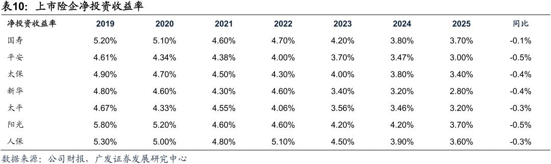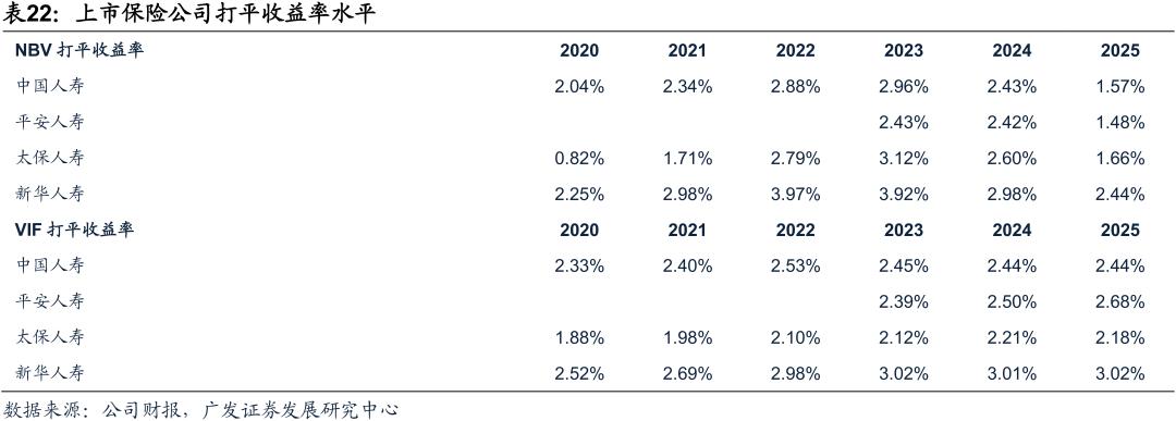 监管持续引导行业降低负债成本,保险公司“NBV打平收益率”持续下行,而代代表存量负债成本的“VIF打平收益率”也开始出现拐点。监管持续呵护行业健康稳健发展,不仅在2023-2025年连续下调预定利率,引导新单负债成本下行,2025年国寿、平安和太保的“NBV打平收益率”降至2%以下,新华整体相对偏高,预计和增额终身寿占比较高有关,但同业也有明显下降。随着NBV打平收益率的持续下降,叠加银保渠道和个险渠道的报行合一推动费差的改善,“VIF打平收益率”也在2025年出现了拐点,其中太保同比小幅下降,国寿保持持平,平安和新华同比也几乎持平。