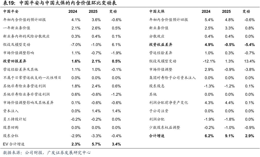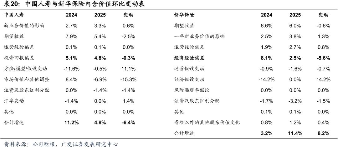 预期回报稳定拉动EV增长,其次新业务价值拉动幅度持续扩大,投资偏差正向贡献拉动EV增长,但市场价值调整因利率上行而有所拖累EV增速。2025年内含价值同比增速分别为太平(19.8%)>新华(11.4%)>太保(9.1%)>平安(5.7%)>国寿(4.8%),从变动因子分析来看: