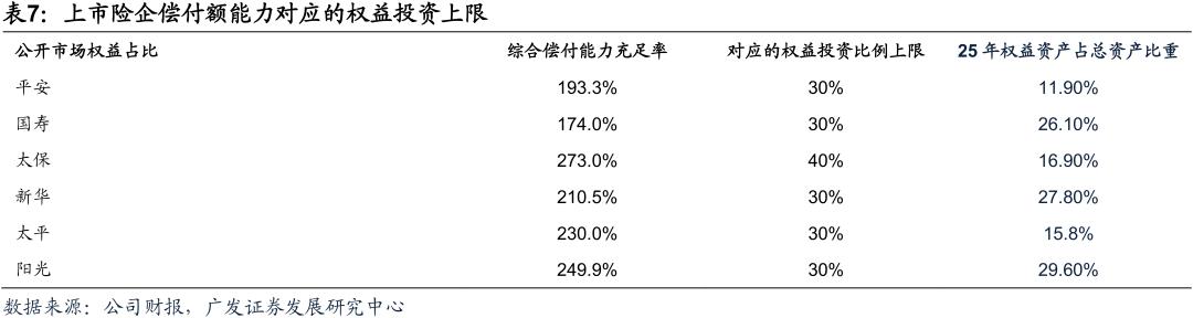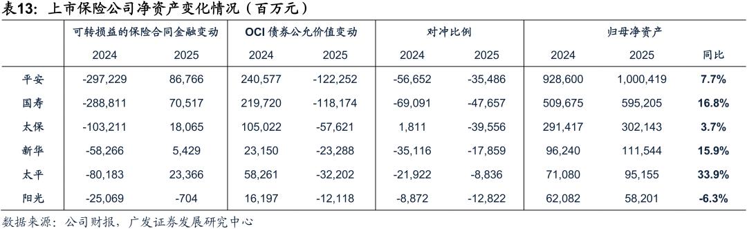 2025年平安、国寿、太保、新华、太平、阳光归母净资产较年初变化幅度为+7.7%、+16.8%、+3.7%、+15.9%、+33.9%、-6.3%。2025年净资产整体均呈现出上行的趋势,一方面受益于利润的大幅增长,其次虽然利率上行,但由于2025年利率主要是远端利率上行较多,导致了保险公司持有的长债公允价值明显下降,而负债评估的利率曲线在20年后是朝着终级利率过渡,曲线上移的幅度低于即期利率幅度,因此导致负债下降的规模没有资产下降的规模大,尤其是长债占比较高的公司影响更大。阳光净资产有所下滑,主因公司调整了负债评估的折现率,导致“可转损益的保险合同金融变动”为负。