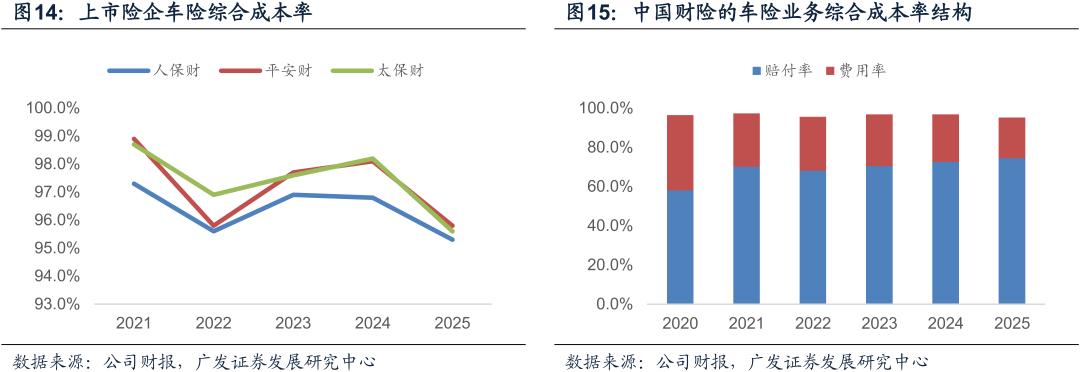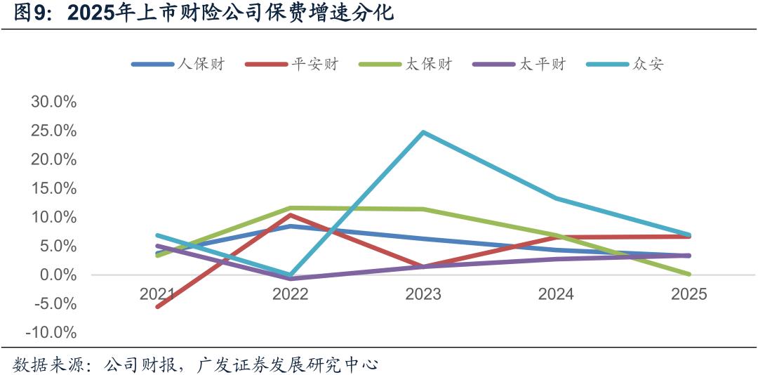 2025年财险保费同比增速依次为众安(+6.9%)>平安财(+6.6%)>太平财(+3.4%)>人保财(+3.3%)>太保财(+0.1%),相较于去年同期的+13.3%、+6.5%、+2.7%、+4.3%、+6.8%表现分化。众安在线受益于公司中高端款“众民保”产品上市驱动健康生态高增;平安增速走扩受益于非车险增速提升,人保财增速表现稳定主要来自车险支撑,而太保财增速下滑主因公司持续优化业务结构,车险提升家自车占比而非车险压缩亏损险种承保规模所致。
