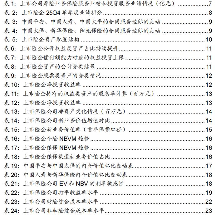 2025年业绩在高基数下全面增长,投资以及税率导致分化,2025年上市险企归母净利润同比增速依次为太平(220.9%)>国寿(44.1%)>新华(38.3%)>财险(25.5%)>太保(19%)>阳光(15.7%)>人保(8.8%)>平安(6.5%),在2024年较高的基数下仍实现了明显增长,其中保险服务业绩稳定增长,而部分公司税率的调整也是业绩增长的原因。从单四季度情况看,受保险公司下半年增加权益配置叠加四季度市场波动,且承保财务损失下降的幅度低于投资收益下降的幅度,导致投资服务业绩明显下降。值得关注的是,代表未来可分配盈余的合同服务边际增速扩大,25年同比增速分别为阳光(+13.3%)>太平(+4.3%)>国寿(+3.5%)>新华(+3.3%)>太保(+3.2%)>平安(-0.8%)。