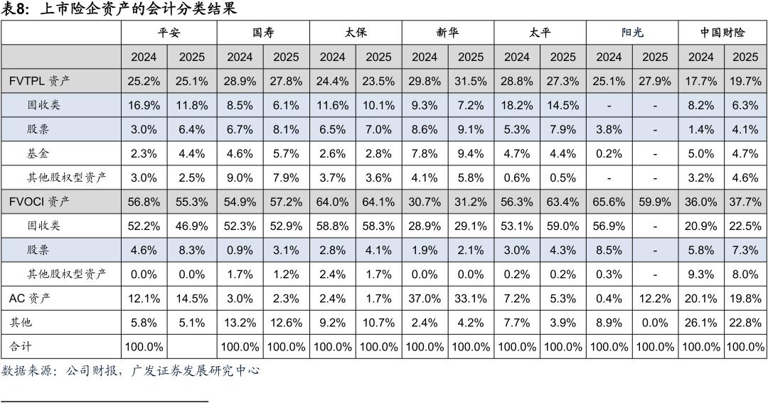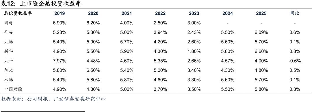 上市险企的总投资收益率整体上行,其中新华同比+0.8pct至6.6%,受益于优异的投资策略,25年“买卖证券价差”规模为373.7亿元,上年同期仅27.3亿元,另外国寿、阳光总投资收益率变化幅度分别为+0.6pct、+0.5pct,其中国寿受益于权益配置比例的提升以及结构的优化,而太保、人保变化幅度仅+0.1pct、0.1pct,其中太保一方面聚焦于红利资产,而在2025年并不占优,叠加太保FVTPL类固收比例较高,导致受利率下行的影响较大;太平总投资收益率同比-0.6pct,整体降幅较中报的明显下降。