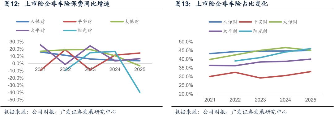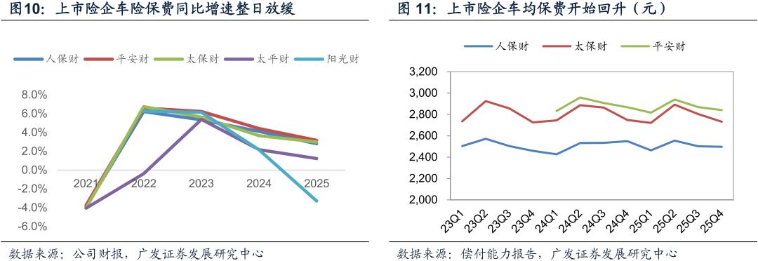 车险方面,头部上市险企的车险增速略微收窄,汽车保有量增速的放缓叠加上市公司车均保费小幅下降等。2025年上市险企车险保费增速分别为:平安财(+3.2%)、太保财(+3.0%)、人保财(+2.8%)、太平财(+1.2%)、阳光(-3.3%),一方面2025年汽车保有量同比+3.68%(来源于wind数据),新车销量放缓导致保有量增速有一定的放缓,另一方面是车均保费同比有所下降,25Q4单季度车均保费为:人保财(2498元)、太保财(2732元)、平安财(2841元),分别同比-2%、-0.6%、-0.9%,环比-0.2%、-2.6%、+1%。
