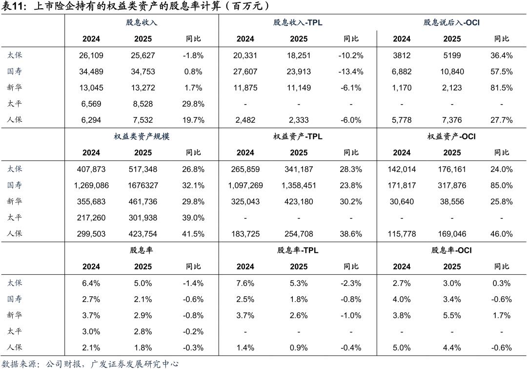 净投资收益率因长端利率的下滑仍有所下滑,2025年平安、国寿、太保、新华、太平、阳光的净投资收益率分别变化幅度为-0.1pct、-0.5pct、-0.4pct、-0.4pct、-0.3pct、-0.5pct,虽然各家公司权益类资产的规模增加,但由于股息率的下降,导致除了人保和太平外,其余保险公司的股息收入并未明显提升。