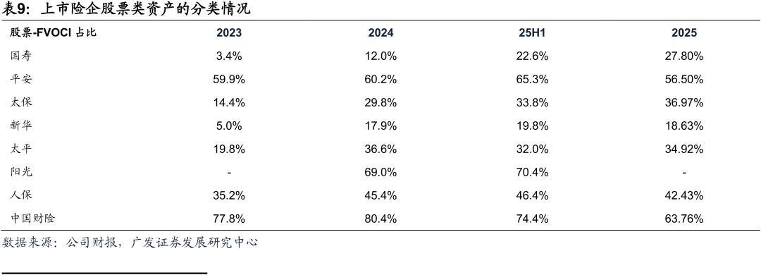 2025年保险公司权益资产会计分类的变化趋势出现了分化,平安、人保及财险等OCI占比相对较高的公司在2025年适度增加了TPL股票的占比,而国寿受此前OCI占比较低的原因,在2025年整体持续提升OCI股票的占比,年末达到27.8%,处于上市险企中位的水平,而新华整体仍相对较低,也展示出公司对于投资能力的信心。