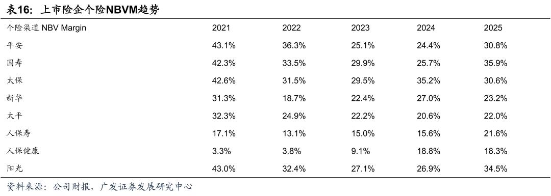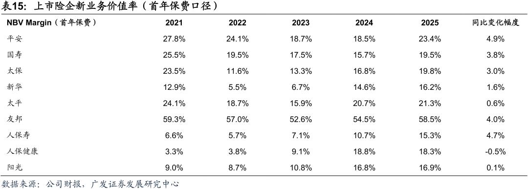 平安的价值率呈现出明显提升趋势,虽然银保渠道占比提升,但银保缴费结构的提升(2024年的55.9%提升至2025年的76.4%),推动银保价值率从20.1%提升至24.5%,远高于同业,而个险渠道受益于报行合一也有明显提升;国寿虽然分红险占比大幅提升,但由于报行合一推动以及长期交产品占比提升,个险价值率同比+10.2pct至35.9%,属于上市险企中最高水平;太保价值率提升不仅是报行合一等政策原因推动,公司调整了非传统险的风险贴现率,在一定程度上利好价值率的提升。