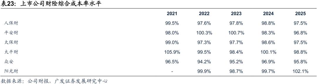 2025年综合成本率分别为人保财(97.5%)、平安财(96.8%)、太保财(97.5%)、太平财(98.8%)、众安(95.8%)、阳光财(102.1%),变化幅度分别为-1.3pct、-1.5pct、-1.1 pct、-1.3 pct、-1.1 pct、+2.4pct。财险公司COR明显改善主要得益于车险报行合一以及公司优化费用管控带来的费用率改善,其次自然灾害减少带来的赔付率改善。其中平安财险COR改善1.5pct最为明显,其中费用率、赔付率分别为26.4%、70.4%,同比变化幅度为-0.9pct、-0.6pct,预计主要是车险报行合一推动费用率的改善,农业保险和货运险等盈利能力提升。人保财COR主要得益于车险报行合一驱动费用率下降3.3pct。太保财险主要得益于上半年自然灾害减少驱动赔付率同比-0.4pct,同时报行合一带来费用率同比-0.7pct。