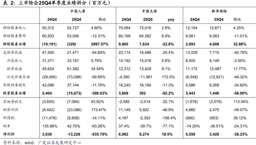 因25Q4单季度市场调整,市场较为关注Q4单季度的情况,我们拆分单季度的利源结构看,年报业绩低于前三季度的核心原因是投资服务业绩的下滑,也是受市场波动加剧,尤其是在中报后引导长期资金入市,上市保险公司在下半年均有明显加仓权益,因此受市场的波动影响短期影响业绩。