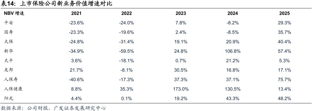 2025年上市险企新业务价值增速分别为人保寿(75.7%)>新华(57.4%)>阳光(48.2%)>太保(40.4%)>国寿(35.7%)>平安(29.3%)>友邦(17.1%)>人保健康(13.4%)>太平(+5.3%),整体在高基数的背景下继续增长,受益于银保推动“量升”和报行合一推动的“价涨”。
