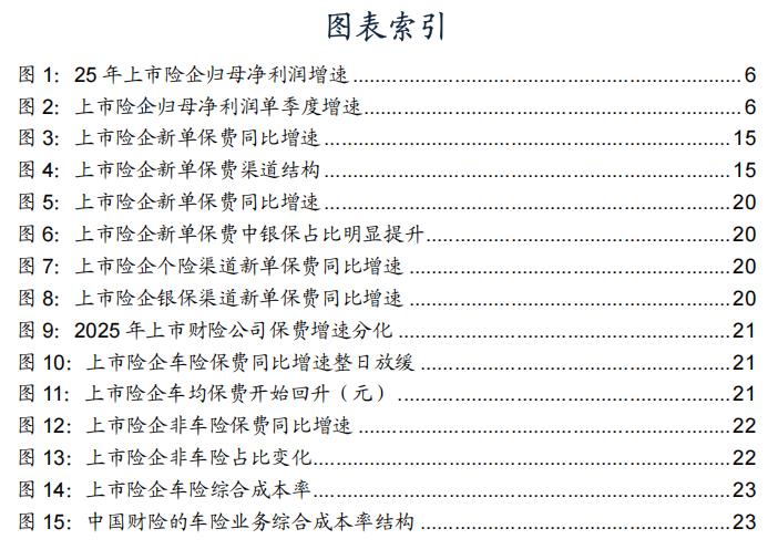 2025年上市险企非车险COR整体有所改善,主要受益自然灾害减少和优化业务结构。2025年非车险综合成本率分别为太保财(97%)平安财盈利能力优化明显,主要受益农险、货运险承保盈利改善。人保财主要得益于自然灾害下降推动企财险COR同比-12.4pct至101%,优化费用管控驱动责任险COR同比-0.7pct至104.5%。太保财主要受益健康险和企财险盈利能力明显改善。展望看,非车险启动报行合一等有望推动费用率改善,我们预计26年综合成本率有望继续改善。