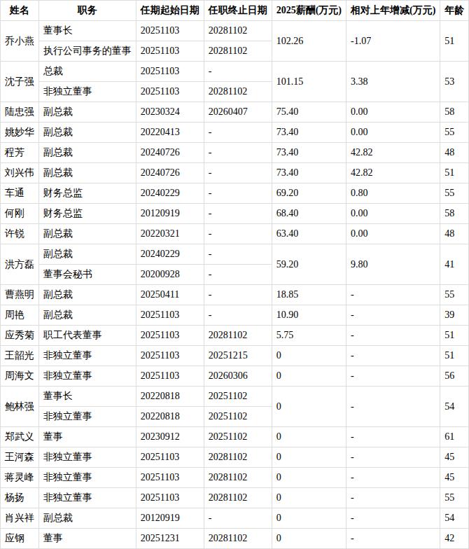 综上所述,本次离任的副总裁陆忠强,年龄58岁,在上述董事和高管中排2/22,2025年薪酬为75.40万元,在董事和高管中排1/8,对公司有何影响,新浪财经-鹰眼工作室将持续关注。