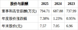 近三年董事和高级管理人员薪酬方面,2023年薪酬总额为737.99万元,2024年薪酬总额为687.88万元,2025年薪酬总额为794.71万元。从2023年到2025年,董事和高管薪酬总额增加56.72万元,增幅7.69%。
