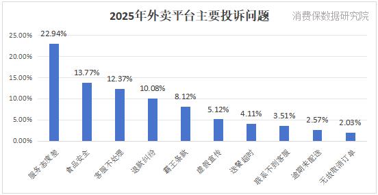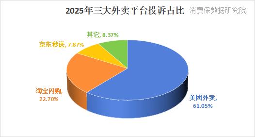 据消费保平台数据,2025年外卖平台相关投诉已达51434件,投诉占比最高为美团外卖(61.05%),其次是淘宝闪购、京东秒送,占比分别为22.70%、7.87%。