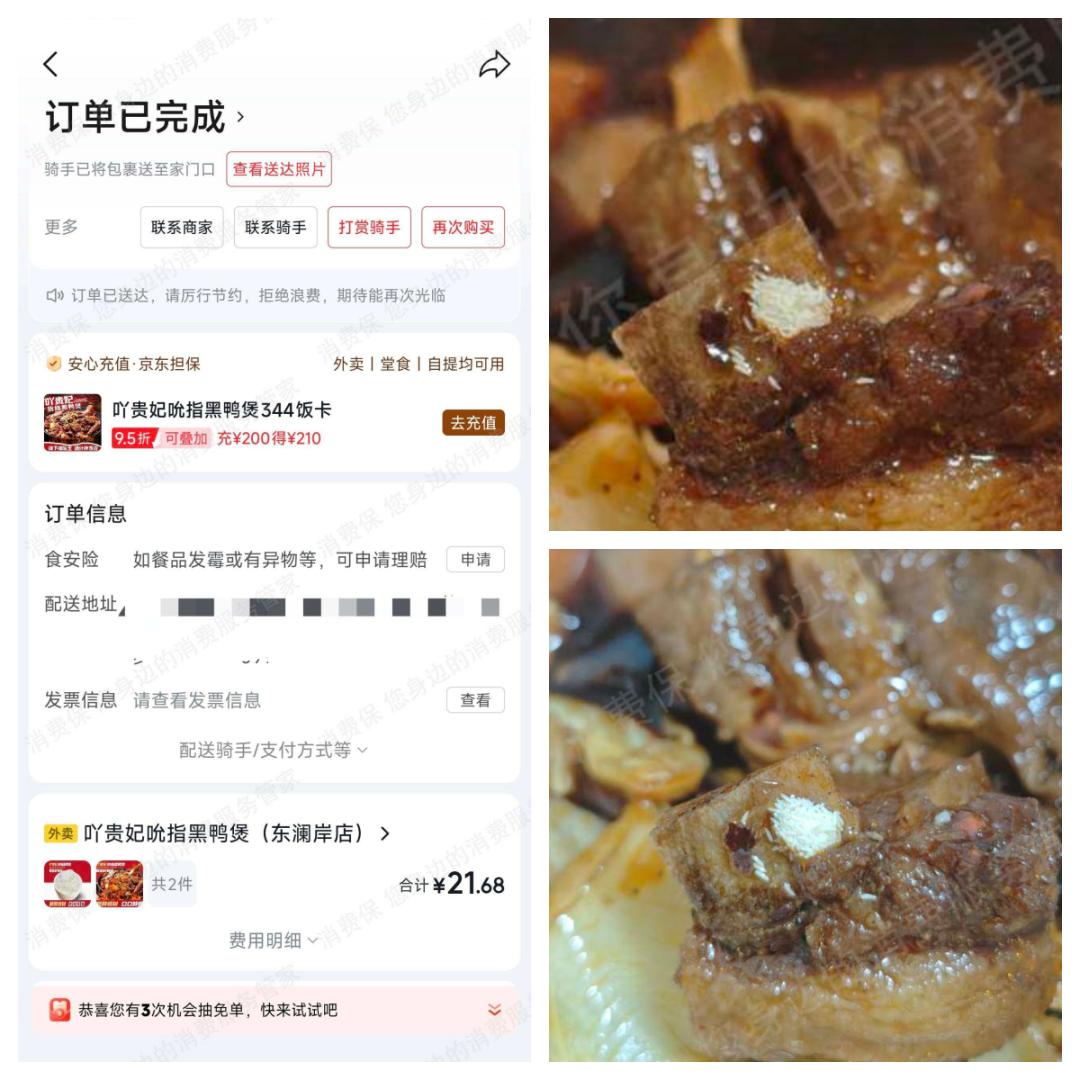 案例二:消费者江先生在京东外卖点餐,食用时发现餐品内有寄生虫,与商家、平台沟通维权,“对方拒不按法律规定赔偿”。