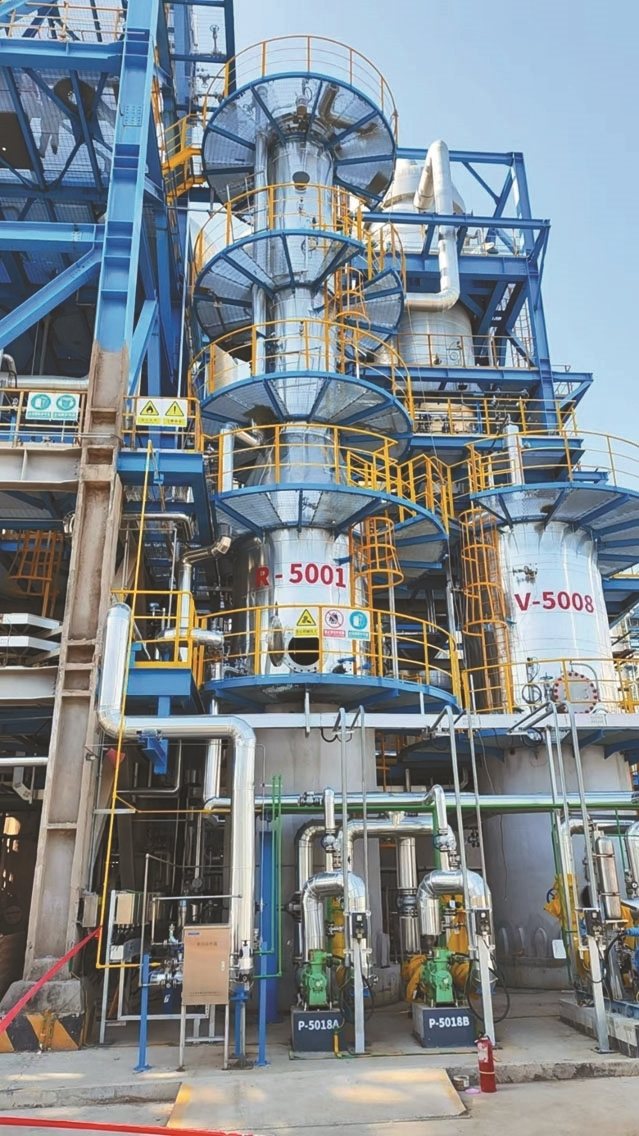 轻烃制乙二醇的反应器又高又细,如何让氢气、液体和固体催化剂在里面“配合默契”,是个世界级难题。在校企协同攻关下,团队创新采用无氢气循环工艺——即氢气一次性通过,不再循环利用,这不仅极大简化了工艺流程,更从源头上消除了氢气高压循环带来的安全隐患。反应器内部采用多段冷激式结构,就像在长长的管道里分段“降温刺激”,精准消除反应过程中产生的热量,让气、液、固三相高效协同,保障了生产的高效与本质安全。“自3月成功开车以来,装置已稳定运行近一个月,首批产品全部合格。”连云港石化有限公司副总经理范昌海说。