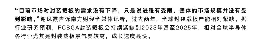 “海豚财经”注意到,越亚半导体管理层对封装载板的细分市场需求存在明显误判。例如,2022年11月,珠海越亚半导体股份有限公司监事、副总经理谢凤霞在接受某媒体专访时表示,“目前市场对封装载板的需求没有下降,只是说进程有受限,整体的市场规模并没有受到影响。过去两年,全球封装载板产能相对紧缺。据行业研究预测,FCBGA封装载板会持续紧缺到2023年甚至2025年”。